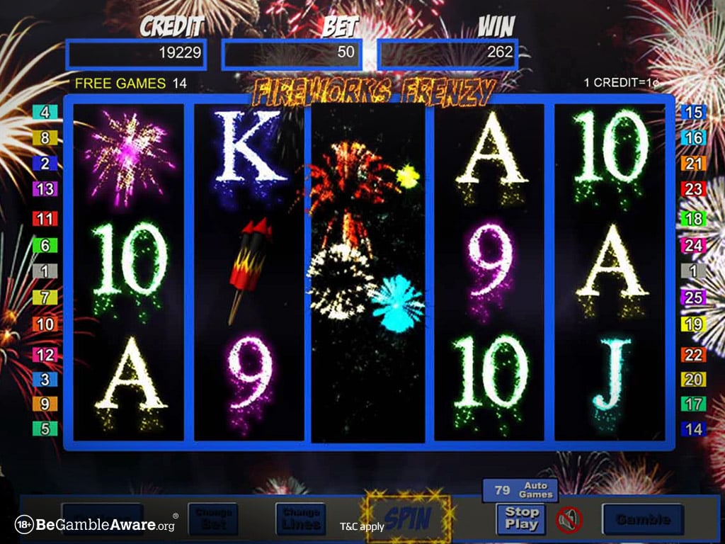 Πυροτεχνήματα και εκρήξεις σε ένα νυχτερινό ουρανό είναι αυτά που συνθέτουν το φόντο του θέματος του κουλοχέρη Fireworks Frenzy. Αυτό το φρουτάκι της εταιρείας Eyecon μπορεί να σου χαρίσει μια απλή και, ταυτόχρονα, συναρπαστική εμπειρία παιχνιδιού με αρκετά κέρδη. Στο συγκεκριμένο φρουτάκι, μπορείς να εκμεταλλευτείς το σύμβολο wild για να σχηματίσεις συνδυασμούς νίκης. Κράτησε τα μάτια σου ανοιχτά για την κόκκινη κροτίδα, αφού μπορεί να ενεργοποιήσει τον γύρο δωρεάν περιστροφών. Ανάλογα με το πόσα τέτοια σύμβολα βρεις, μπορείς να κερδίσεις από 15 μέχρι 25 δωρεάν περιστροφές. Πολλαπλασιαστές, επαναλήψεις περιστροφών, και πολλά άλλα υπόσχονται μια αξέχαστη εμπειρία σε ένα φρουτάκι που μπορεί να απογειώσει τα κέρδη σου!