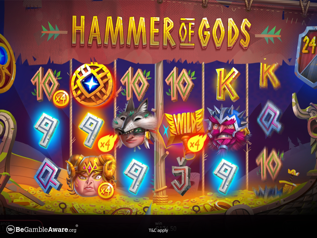 Με θέμα του τη Σκανδιναβική μυθολογία το παιχνίδι Hammer of Gods υπόσχεται να σου κεντρίσει το ενδιαφέρον από την πρώτη κιόλας στιγμή! Στο πλέγμα θα δεις έξι τροχούς και 3 γραμμές, ενώ θα μπορείς να κερδίσεις με 729 τρόπους. Τα σύμβολα παραπέμπουν στο θέμα και δίνουν μια αίσθηση καρτούν, ενώ τα άψογα γραφικά και ηχητικά εφέ ολοκληρώνουν την εμπειρία σου. Αυτό που θα πρέπει να γνωρίζεις είναι πως το σπαθί του Thor είναι το σύμβολο wild, ενώ η χρυσή ασπίδα είναι το scatter που ξεκλειδώνει τον μπόνους γύρο δωρεάν περιστροφών. Υπάρχει επίσης και ένας μετρητής δίπλα από το πλέγμα, ο οποίος φωτίζει μια επιπλέον θέση για κάθε ειδικό σύμβολο wild που εμφανίζεις. Βρες τον αριθμό που απαιτείται, και τα wild θα εμφανιστούν στο πλέγμα σου σε τυχαίες θέσεις!