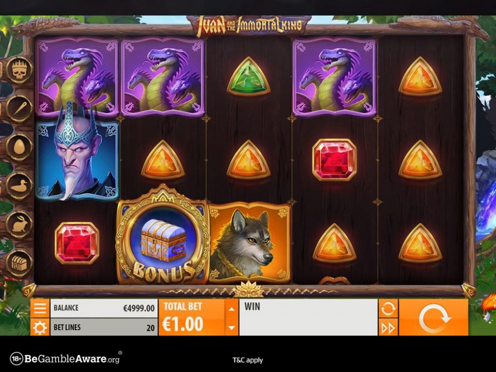 Με έμπνευση από την Ρωσική παράδοση, και με στοιχεία φαντασίας, το παιχνίδι Ivan and the Immortal King σε προσκαλεί σε ένα όμορφο ταξίδι. Στη βασική σου οθόνη θα σεις πέντε τροχούς, γεμάτους με πολύτιμους λίθους, δράκους, λύκους, μια βασίλισσα με τον βασιλιά της, αλλά και τον ίδιο τον Ιβάν. Ανάμεσα σε αυτά υπάρχει και το σύμβολο wild, που θα σε βοηθήσει στο σχηματισμό νικητήριων συνδυασμών. Για να ενεργοποιήσεις τη λειτουργία μπόνους, θα πρέπει να βρεις τουλάχιστον 3 σύμβολα scatters. Κάθε επιπλέον σύμβολο χαρίζει μεγαλύτερο αριθμό δωρεάν προσπαθειών, και προσθέτει πολλαπλασιαστή στις νίκες σου. Να έχεις τα μάτια σου ανοιχτά σε αυτό τον γύρο, καθώς μπορεί να εμφανιστεί το σύμβολο Baba Yaga, και να σου χαρίσει επιπλέον εκπλήξεις!