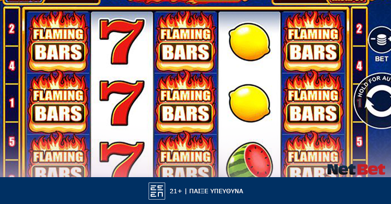 Το Flaming Bars αποτίει φόρο τιμής στα παραδοσιακά φρουτάκια, με μια ρετρό εμφάνιση που θυμίζει παλιές εποχές. Οι κύλινδροι έχουν ένα λευκό φόντο, ενώ το μοτίβο στο μπλε background θυμίζει ταπετσαρία. Τα σύμβολα είναι φωτεινά και ευδιάκριτα, με τα φρούτα να κυριαρχούν.